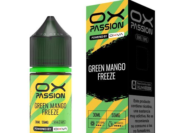 Green Mango Freeze de Ox Passion (de la marca OXVA) es una esencia con un sabor refrescante que se combina con la acidez del mango verde con un toque cítrico y la frescura de la menta.